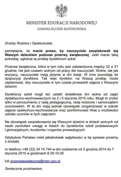 Do tego poziom nauczania jest żałosny. Np. nauczyciel matematyki znika na pół roku, ale są zastępstwa z... plastyki i muzyki. Proponuję zgłosić wszystkim rodzicom swoje uwagi na adres: przerwaswiateczna@men.gov.pl